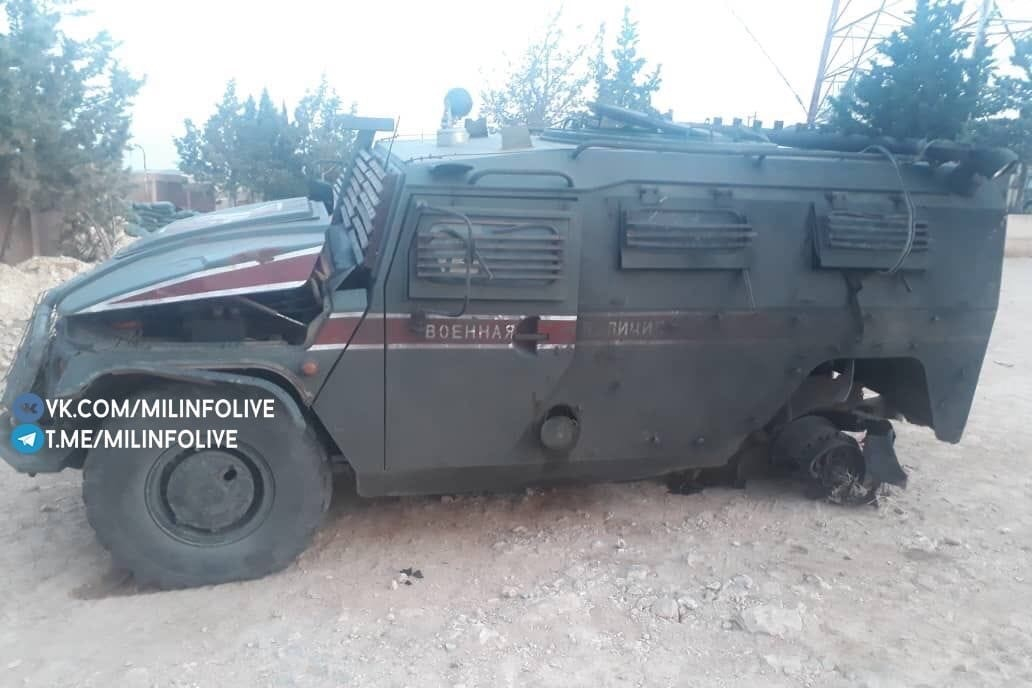 Бронеавтомобиль АМН 233114 "Тигр-М" Военной полиции, получивший повреждения в результате наезда на взрывное устройство 9 июня 2020 года в районе населённого пункта Кобани (провинция Алеппо, Сирия). Пострадал один военнослужащий.