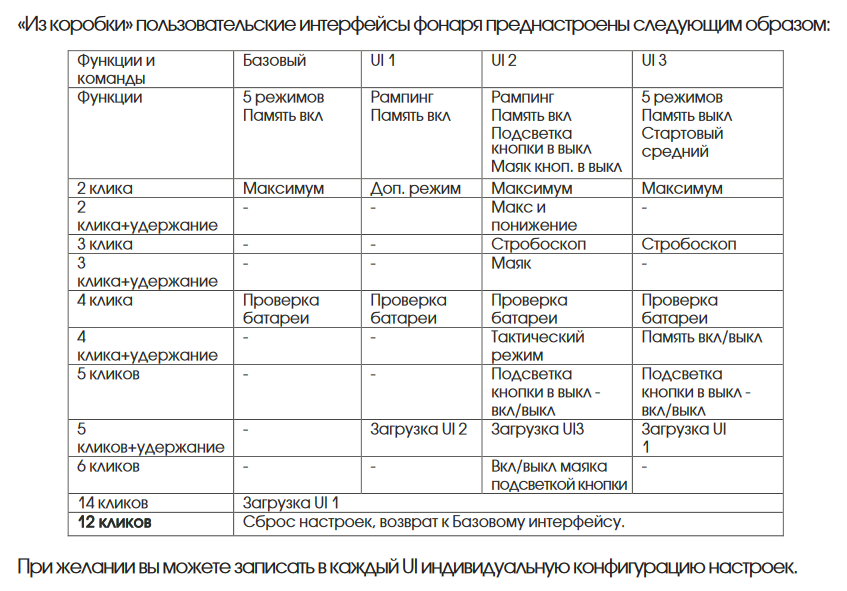 Преднастроенные интерфейсы (User Interfaces) налобного фонаря YLP Gekko 1.0 - иллюстрация к теме YLP Gekko 1.0 - налобный фонарь с настраиваемым управлением и питанием от аккумулятора 18650